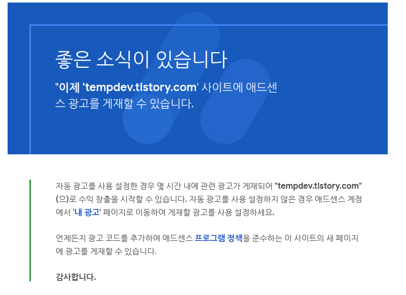 블로그에 광고를 게재할 수 있게 되었다. 신청 당시에 글이 많은 것도 아니었다. 그렇다고 포스팅 당 글자 수가 많은 것도 아니었다. 그럼에도 너무 쉽게 통과가 되어서 당황스러웠다. 같은 주제로 글을 올렸던 것이 도움이 되었던 것일까? 무엇이 애드센스를 승인하는 알고리즘의 마음을 사로잡았는지는 모르겠지만, 통과가 되어 기분이 나쁘진 않았다.