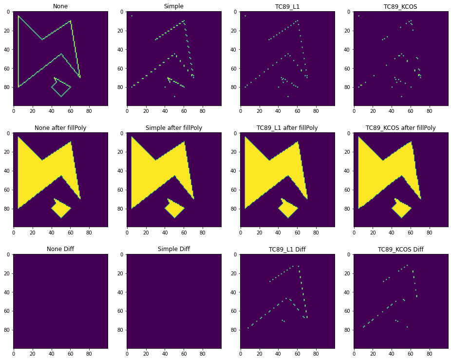 필요한 점들을 간추려서 가져오는 방법은 findContours에서 Contour approximation method 옵션을 CHAIN_APPROX_SIMPLE로 부여하는 것이다. 원하다면 CHAIN_APPROX_TC89_L1, CHAIN_APPROX_TC89_KCOS 로도 부여가 가능하다. 각각이 다른 근사 알고리즘이다. 각 옵션에 대해 findContours를 실행해보고 이들의 결과를 확인하고, 가져온 점들로 다시 fillPoly를 수행하여보자. 다시 생성된 다각형들이 본래의 다각형과 차이가 있는지도 확인해보았다.
