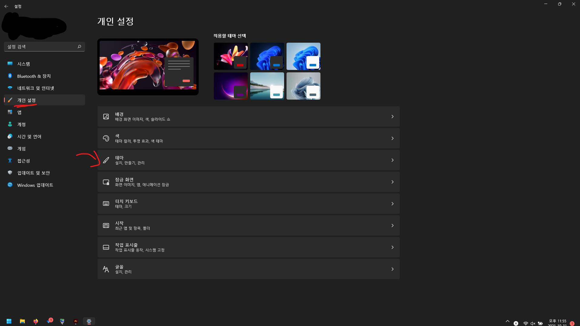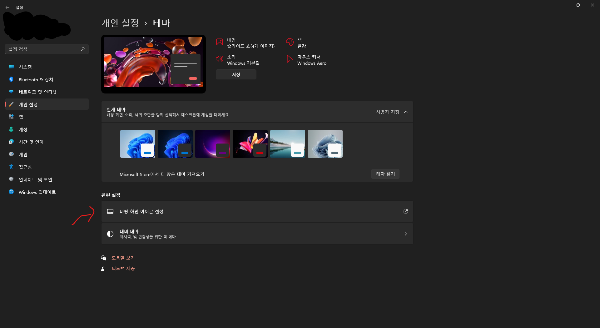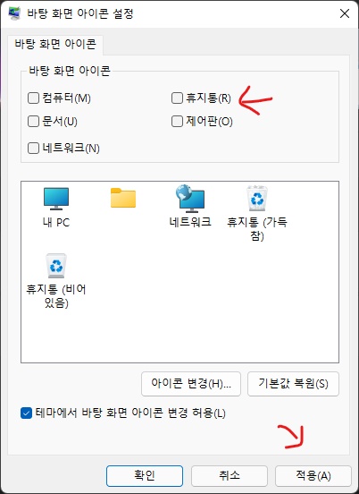 설정 > 개인설정 > 테마 > 바탕화면 아이콘 설정으로 들어가 준다. 그리고 휴지통을 '체크해제' 한 후 '적용'을 누르면 된다.