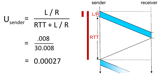 - U_sender = (L / R) / ( RTT + (L / R)) = 0.008 / (30.008) = 0.00027