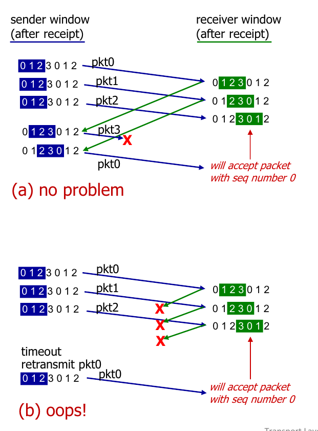 - ⇒ win size ≤ (# seq num) / 2 will fix this