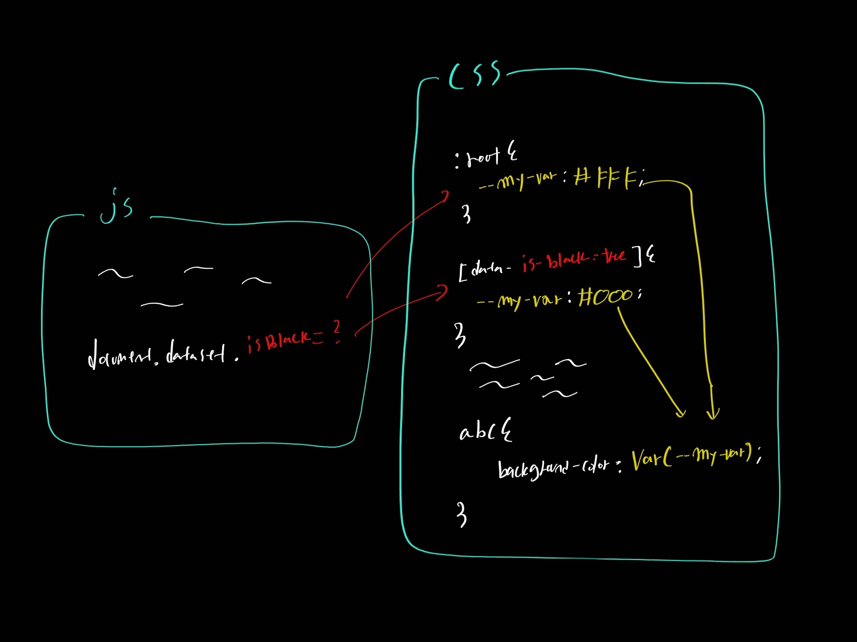 Data attribute도 사용됩니다. isBlack 의 값에 따라 적용되는 Custom Property 의 값이 달라지게 할것입니다. 예를 들어 위 사진에서 isBlack이 true 값이 아니라면 기본 테마를 사용하라는 의미입니다. 기본으로 설정된 값이 사용될 것이기 때문에 Custom Property 의 값은 :root 에서 정의한 값을 사용하게 됩니다. 그러나 isBlack 값이 true 값이라면 [data-is-black=true]{...} 부분에서 다시 설정된 Custom Property 을 사용합니다.