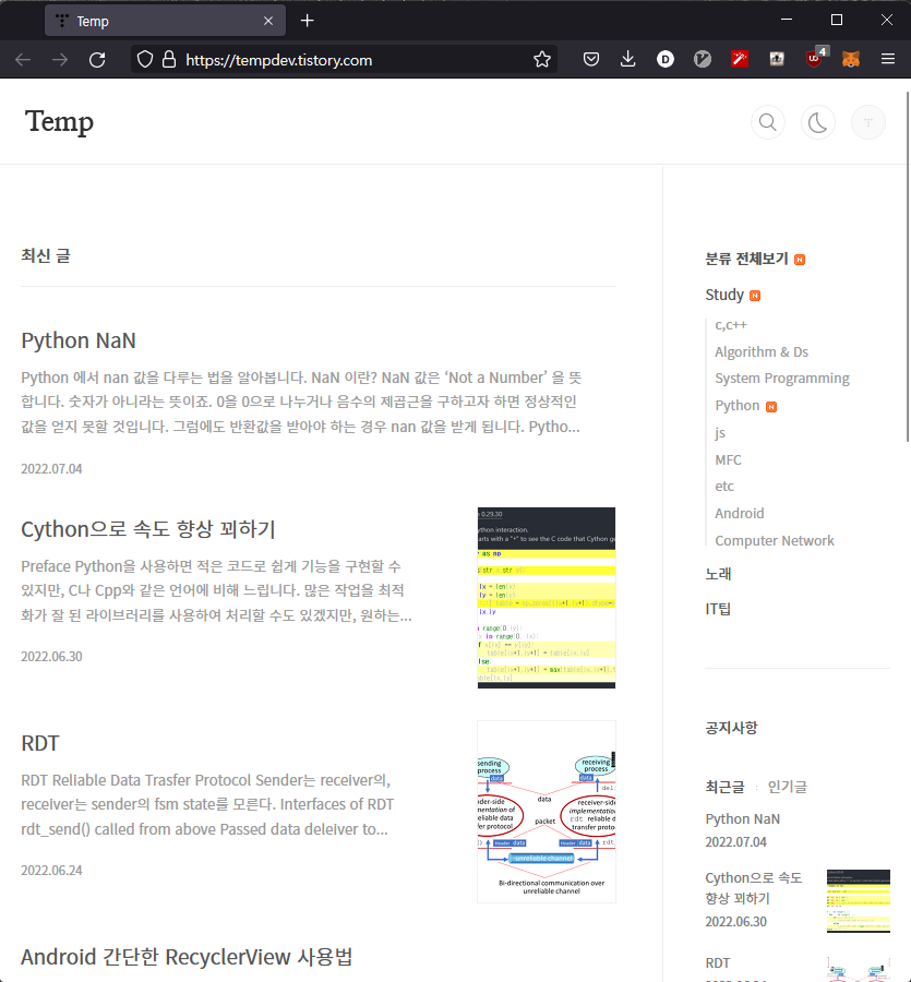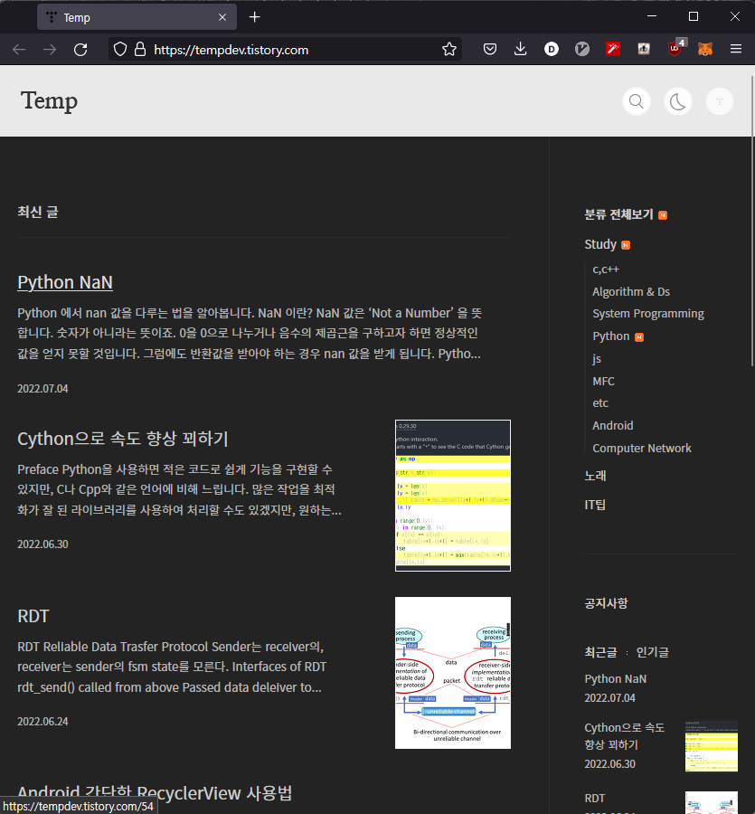 이 블로그에선 우측 상단의 달모양 버튼을 누르면 블로그의 테마가 바뀌는 것을 확인할 수 있습니다.