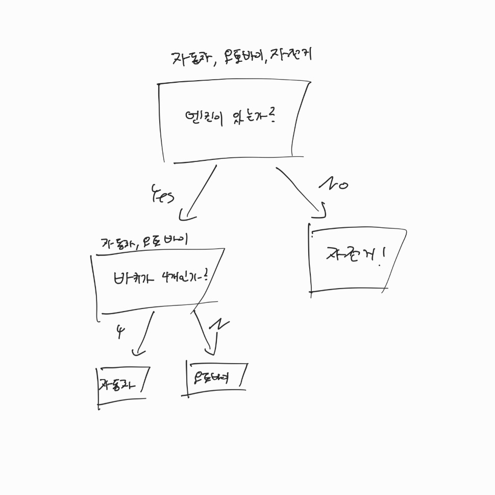 Decision tree (결정트리)는 매 노드에서 특정 feature를 이용하여 분기를 나눔으로 데이터를 구분합니다. 자동차, 오토바이, 자전거를 구분한다고 합시다. 엔진이 있는지로 데이터를 먼저 구분할 수 있습니다. 엔진이 있는지로 먼저 구분하였다면 엔진이 존재하지 않는 자전거는 바로 구분할 수 있을 것입니다. 엔진이 존재하는 것들은 자동차, 오토바이가 있습니다. 이제, 이들 중 바퀴의 개수로 이들을 구분합니다. 바퀴가 4개인 경우 자동차, 그렇지 않은 경우 오토바이로 구분합니다. 이 과정을 트리구조로 그리면 아래와 같은 그림이 나옵니다.