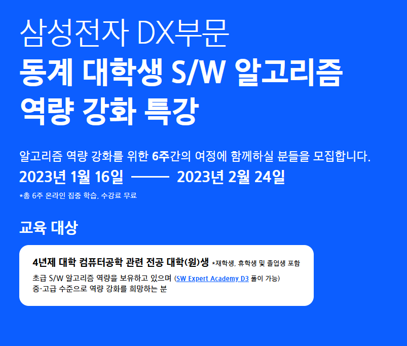 이번 동계 방학에는 삼성 Dx 부문에서 운영하는 "대학생 SW 알고리즘 역량강화 특강"을 수강하였다. 4학년 올라가는 겨울방학, 계절학기가 끝나고 잠깐 무료하던 차에 어떤 내용을 얻어 갈 수 있는지 호기심에 신청했었다.