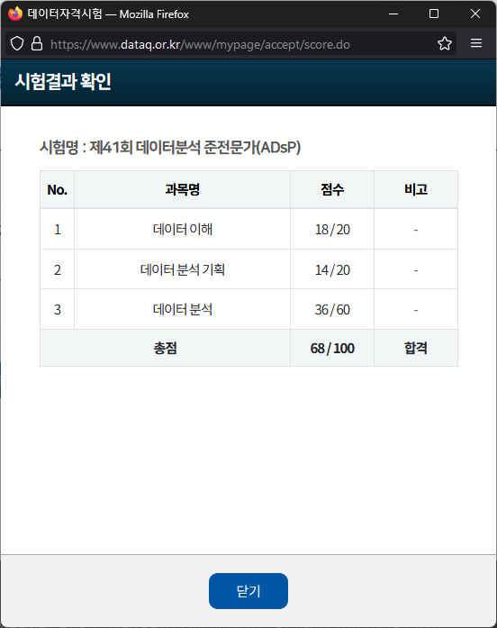 사전점수가 공개되었을 떄 난 내 점수가 내 생각보다 높음에 놀랐다. 유튜브에서 봤던 내용이 생각보다 많이 나온 것인지, 찍었는데 맞은 문제가 많았는지는 모르겠다. 하지만 이제 그것은 중요하지 않았다. 과락 없이 60점만 넘기는 것이 나의 목표였고, 이루었기 때문이다. 이제 더 이상 회사에서는 이 시험을 응시하라고 메일을 보내지 않을 것이다.